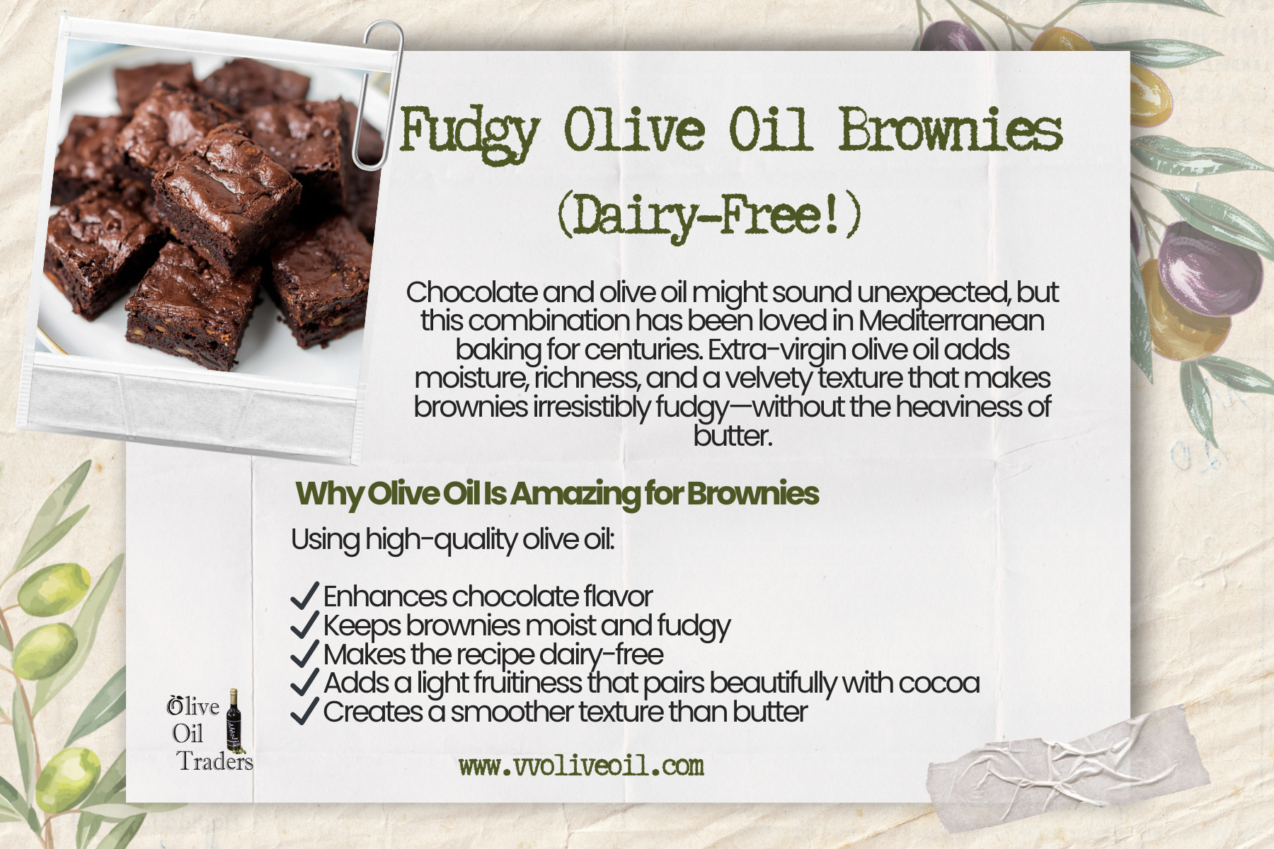 Rich, Fudgy Olive Oil Brownies for the Holidays Chocolate and olive oil might sound unexpected, but this combination has been loved in Mediterranean baking for centuries. Extra-virgin olive oil adds