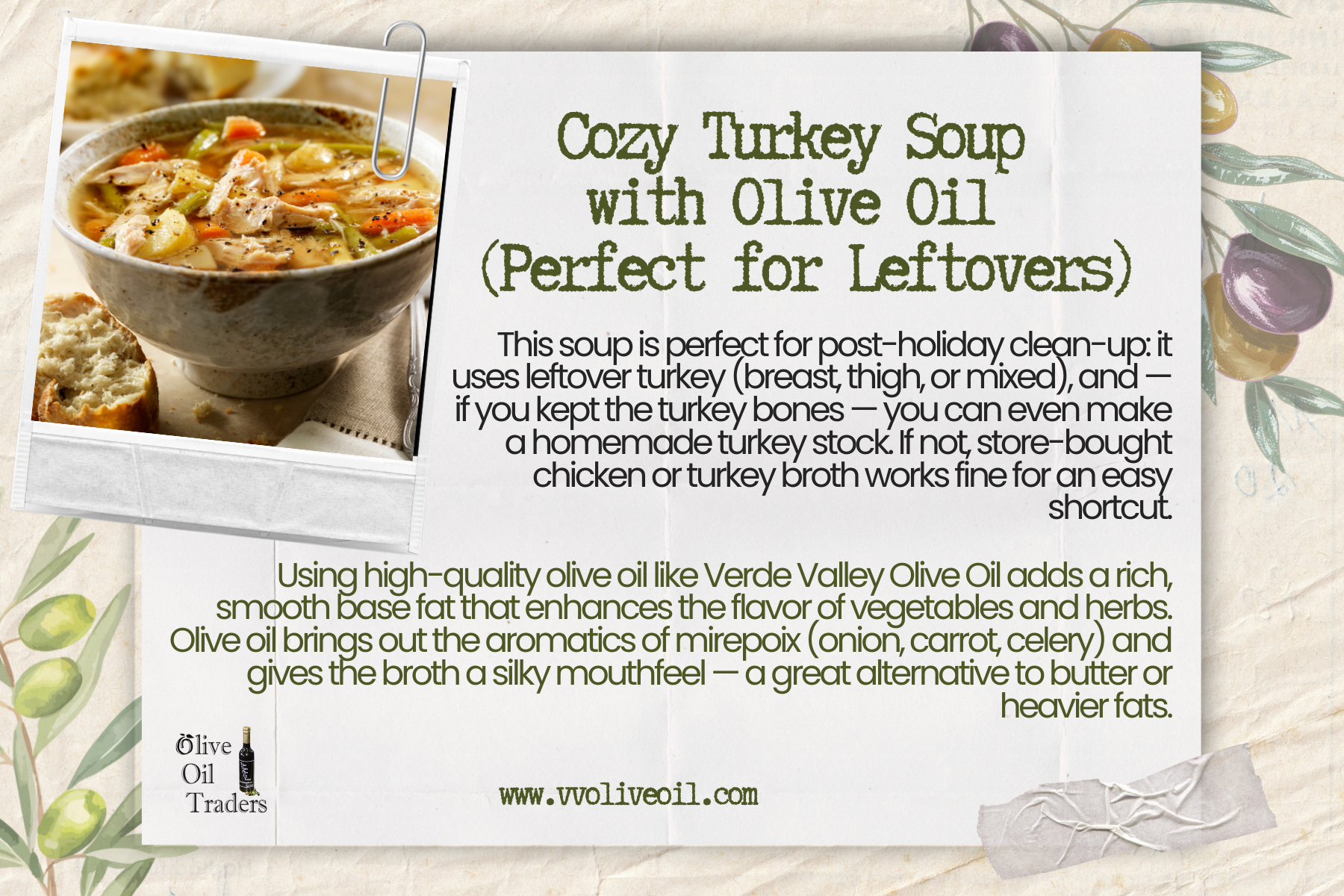 Leftover turkey is a gift that keeps on giving — with just a bit of olive oil and a few pantry staples, you can transform it into comforting soup, cozy pasta, rustic stew, or a simple herby main dish. Using a quality olive oil like Verde Valley Olive Oil adds depth, flavor, and a lighter, more versatile base.