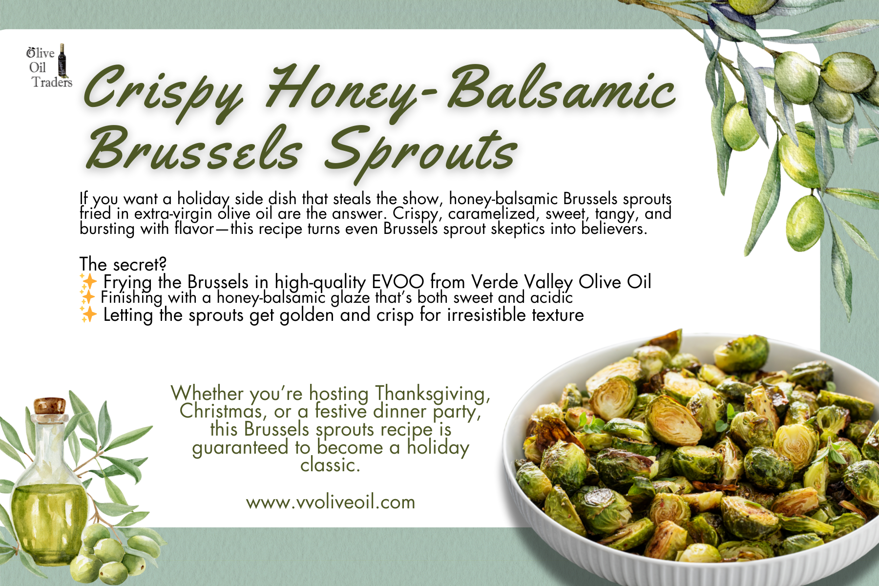 Crispy Honey-Balsamic Brussels Sprouts (Holiday-Perfect!) If you want a holiday side dish that steals the show, honey-balsamic Brussels sprouts fried in extra-virgin olive oil are the answer. Crispy, caramelized, sweet,